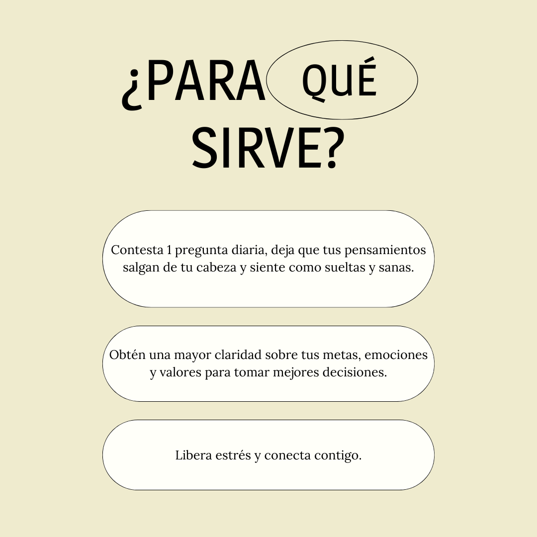 - Contesta 1 pregunta diaria, deja que tus pensamientos salgan de tu cabeza y siente como sueltas y sanas.