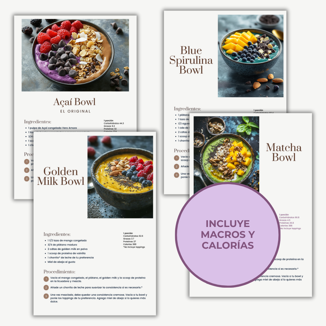 Descubre 10 recetas únicas de smoothie bowls, desde el clásico açaí hasta opciones innovadoras con matcha y spirulina. Este recetario transformará tu manera de disfrutar los desayunos, haciéndolos no solo deliciosos sino también súper nutritivos. Cada receta viene con instrucciones súper claras y tips que te van a ayudar a ponerle tu toque personal.