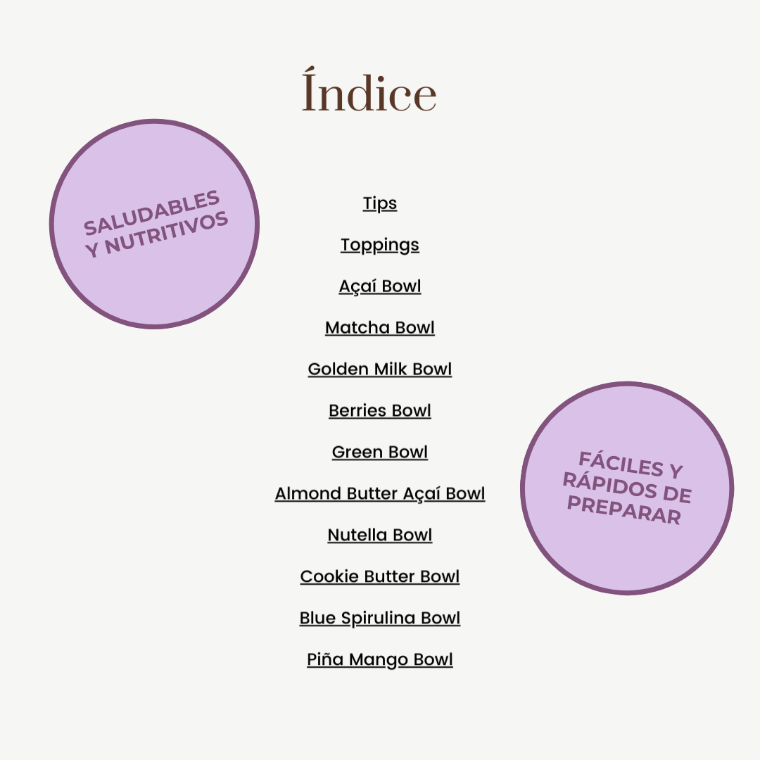 1 PDF con 10 recetas de smoothie bowls en páginas con fotos coloridas, información nutricional detallada, y consejos para hacer tus bowls más fácil.